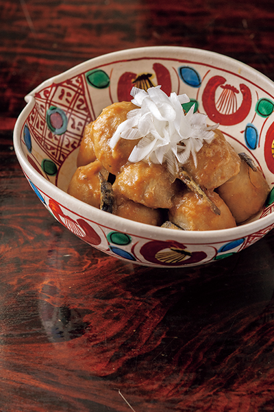 里芋…8個 煮干し…10本 A[水…300ml 砂糖、醤油…各大さじ2] 三州三河みりん…大さじ2 ごま油屋のラー油…小さじ1/2 長ネギ1/2本
