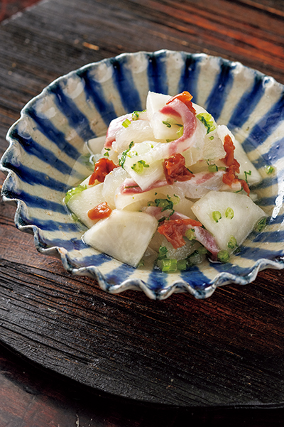 - 鯛を細く切り、1を適量、太白胡麻油と和える。