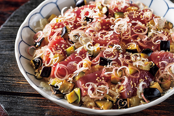 - 皿に寿司飯を盛りつけ、鰹、ナスをのせ、ミョウガをちらし、いり胡麻 白をふる。