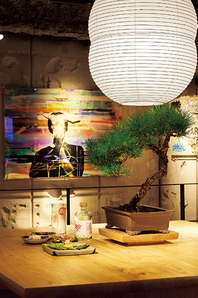 盆栽と提灯、ストリート系グラフィックアートが同じ空間に。和も洋も違和感なく融合する「場」がYAOYA Ba。U字カウンター20席、テーブル16席。