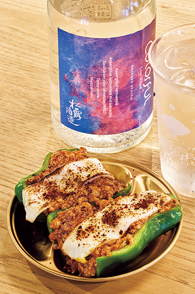 まずはコレ!ではじまるパリパリピーマンは、全店ちがうフレーバー。カンナムスタイルはチーズとろける韓国料理テイスト。松露酒造の香りが華やかな芋焼酎Colorfulと。