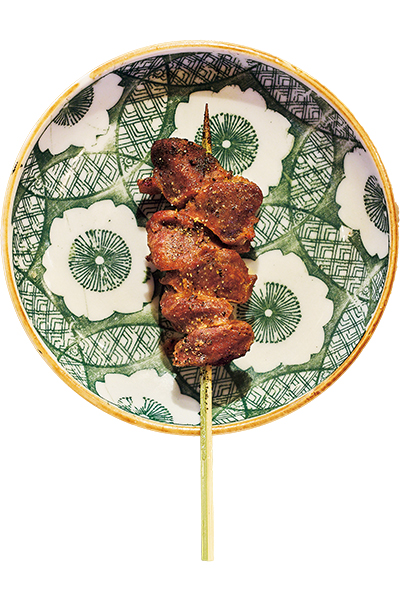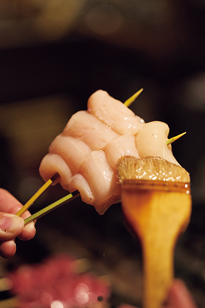串打ちした肉や内臓にさっと太白胡麻油をぬり、炭火の上に。この効果は絶大! 油の膜が肉汁を逃さず、ふっくら、みずみずしく焼きあがる。酸化に強い太白胡麻油だから、高温の炭火で焼いても油くさくなることはない。