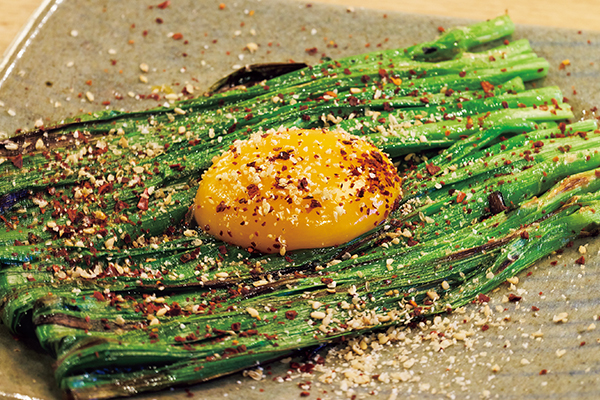 ニラ…1束 太香胡麻油と合わせたニンニクオイル、塩、ダシ醤油…各適量 卵黄…1個分 いり胡麻 白、韓国唐辛子…各適量