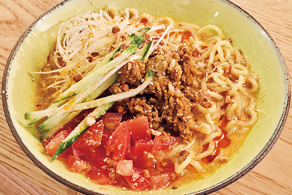鶏ミンチの担々肉味噌とスープは、ちょっとカレーを感じるようなスパイシー感。純ねり胡麻 白ソフトパウチでまろやかに。具のトマトの酸味がキレをだす。