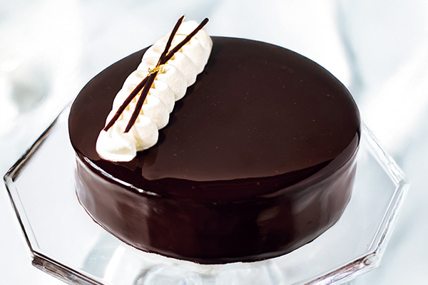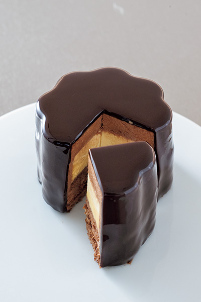 コロンビア産カカオのビターなチョコレートムースにベルガモットの香り。バニラムースとトロピカルムース、チョコレートスポンジ、ナッツクランチが層になったケーキ。ツヤツヤに光り輝くコーティングは、チョコレートと太白胡麻油がきれいに乳化している証。エルダーフラワーの香りのホワイトもある。