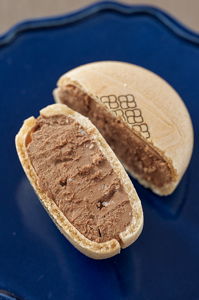 チョコレートと太白胡麻油を乳化させて泡立てた“エアチョコ”たっぷりのハナレモナカ。チョコレート、アールグレイ、抹茶、ほうじ茶、山椒のほか、1月初旬まではシーズン限定のあまおうも。