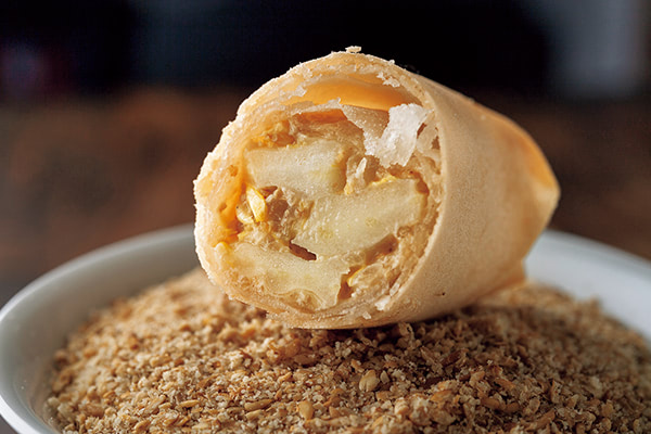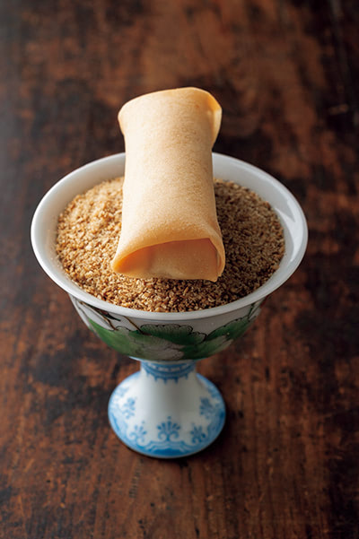 春捲の餡は白すり胡麻でとめる。「すり胡麻の力強さと、ほどけるような口当たり。片栗粉でも試作しましたが、とろみやデンプンの味があるため、イメージ通りの清らかな味わいにはならなかった」(川田シェフ)。