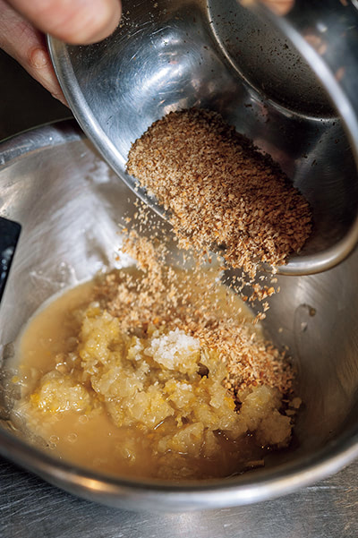 醤はタルタルソースのようにツヤがでて乳化するまできちんと混ぜる。太白胡麻油は上品なコクとうまみをだし、なめらかさを生みだす。「微量でも入れると入れないとでは大違い」(川田シェフ)