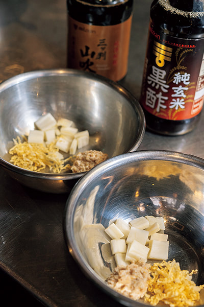 - ②と①を合わせ、2つに分ける。それぞれに三ツ判山吹、純玄米黒酢を加えて2種の餡とする。