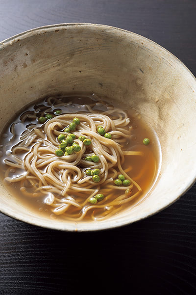 - そばをゆであげて水にとって締め、器に盛る。②の薬膳だしを注ぎ、実山椒オイルをかける。