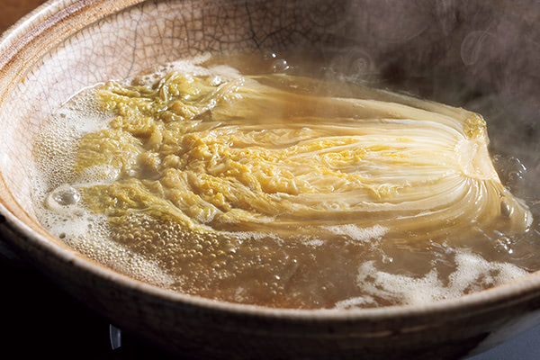 - 土鍋に①を2Lと純米酢、白菜を入れて弱火で1時間炊く。