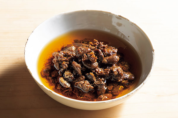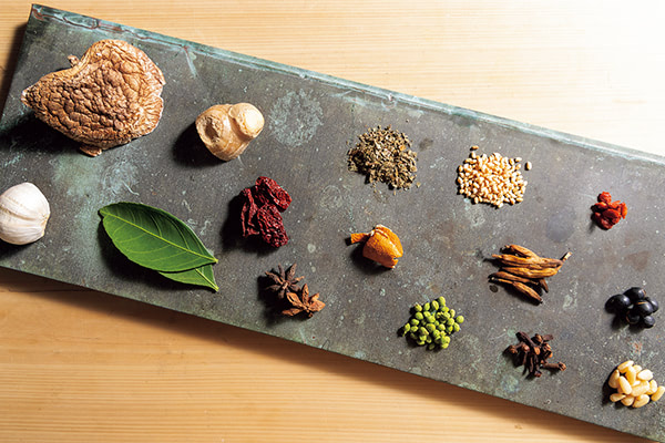 薬膳だし(つくりやすい量)[水…4L 酒…180ml 煎り米…30g 松の実…30g ショウガ…25g ニンニク…25g 干し椎茸…20g 実山椒…10g クコの実…10g 黒豆…10g 陳皮…10g ミカンの葉…10g 金針菜(乾燥)…10g ビワの葉…5g ナツメ…4個 クローブ…4個 八角…2個]