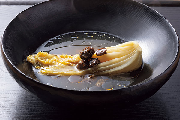 - ②の白菜を切り分けて盛りつけ、②の薬膳だしを張る。浜納豆オイルを添えて供する。