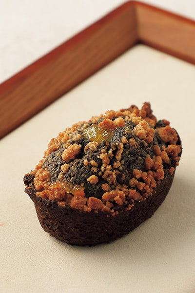 バターと太白胡麻油を併用し、純ねり胡麻 黒ソフトパウチで香味をだしたフィナンシェ。絞り入れた柚子のコンフィチュールと、軽い歯ごたえのクランブルがアクセント。黒ごまと柚子の相性◎。