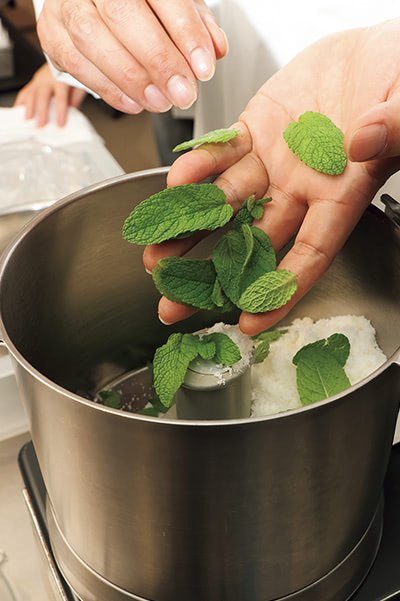 - グラニュー糖の一部とミントの葉(この日はスペアミント)をフードプロセッサーに入れ、ミントが細かくなるまで回す。