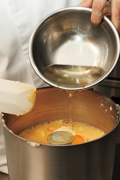 - 残りのグラニュー糖、全卵、マスカルポーネ、マイヤーレモンの果汁と皮のすりおろしを加えて混ぜ、次に合わせてふるった薄力粉とベーキングパウダー、アーモンドパウダーを加えてさらに混ぜる。バター、太白胡麻油を加えて混ぜる。混ぜ終わりは約27℃。