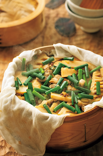 「脳腸相関」は、心身ともに健康で美しく食べるために憶えていたいフレーズです。その意味は、脳と腸は連動していて、腸内環境がいいと、脳も健康的になり、ストレスなどが軽減されることを指しています。腸内環境の改善の一歩は、食物繊維をたくさん摂ることから。タケノコは食物繊維が多く、脳を活性化させるチロシンも豊富に含むので、旬のおいしさを味わいながら、心身をよいコンディションに導きます。具は冷やごはんの上にのせ、せいろで蒸していただきます。蒸し調理は熱々でもどこか熱の具合がおだやかで、お腹の隅々まで温かさがじんわり伝わります。蒸している間に調味料や圧搾純正胡麻油 濃口のうまみや香りがごはんに行きわたってやさしく調和します。