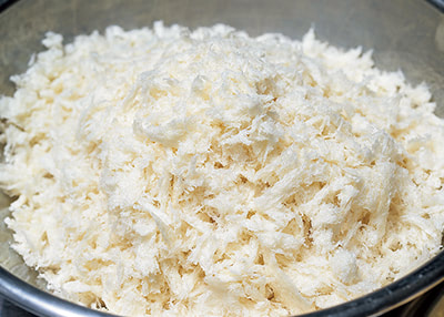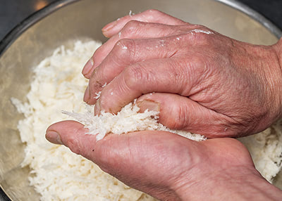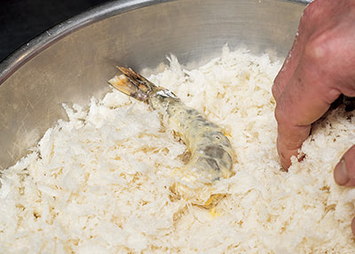 10. そのまま頭側から生パン粉の上に置き、生パン粉をたっぷりとのせる。手にのせ、寿司をにぎるようにギュッギュッとにぎる。生パン粉がまわりにたっぷりついているので、力を入れてにぎっても海老はつぶれない。