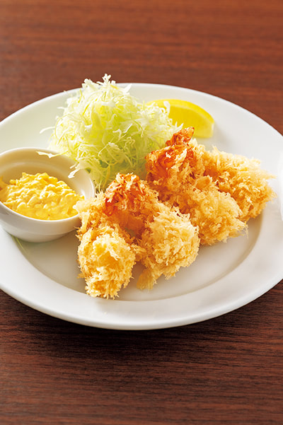 パン粉の衣がサクッとうまい海老フライ。ウスターソースをかけ、自家製タルタルソースとともに口に運ぶ口福。
