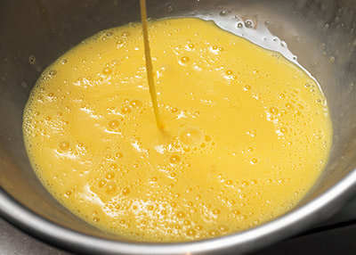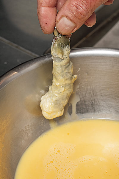 9. 尾をもち、頭側から卵液につけ、余分な卵液をよく切る。