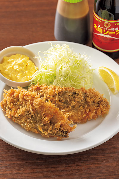 上身と下身に分けたアジフライは、ふわりと身がほどけるよう。卵の風味がやさしい自家製タルタルと、好みでウスターソースでもとんかつソースでもいける。