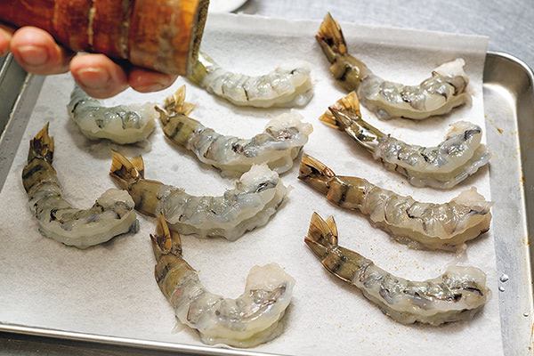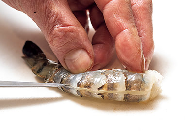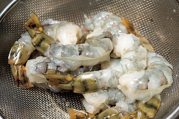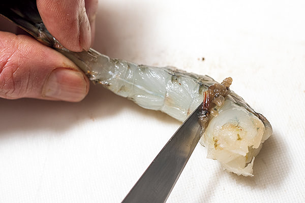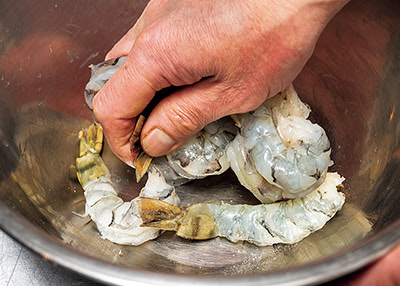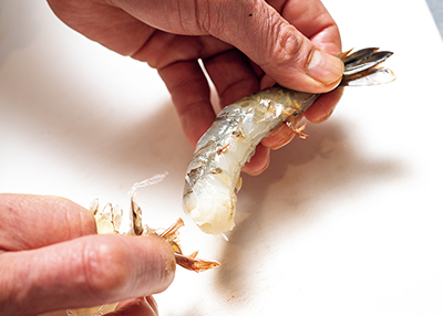 1. 海老は冷凍のブラックタイガーでOK。両側の脚の間に人さし指を入れ、尾側の1節を残して殻をむき取る。背側に包丁で切り目を入れ、背ワタを取る。