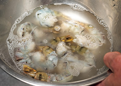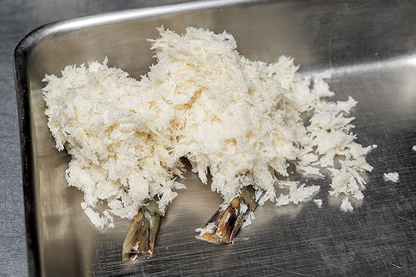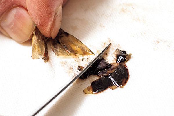 2. 脚のつけ根の残っている部分を包丁の刃先でこそげ取る。この部分はアクがあり、くさみの原因になるのでていねいに。