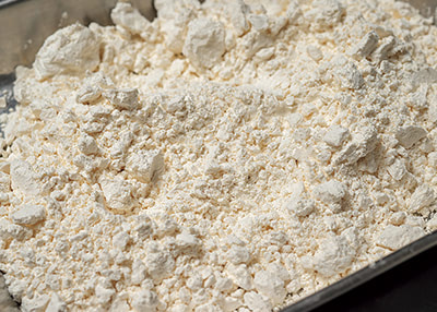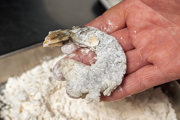 8. 海老の尾をもって粉の上に置き、全面にたっぷりとまぶし、余分な粉を落とす。背の切り目の内側までていねいに。尾と残した殻にはごく薄く。