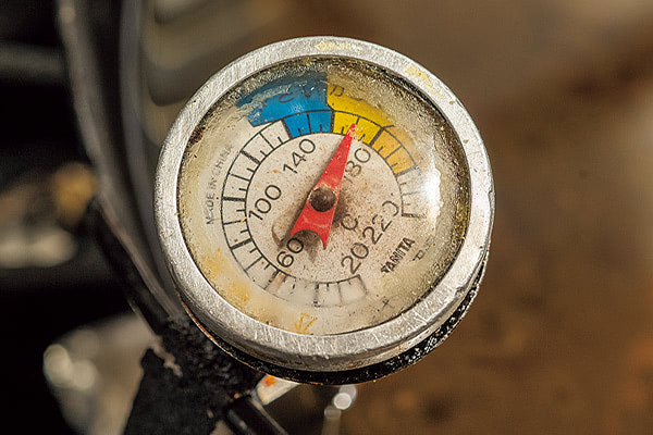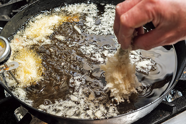 12. 揚げ油を火にかけ、165℃に熱する。旬香亭では平成のフライオイルC-1(コーン油と焙煎ごま油のブレンド・業務用)を使用。家庭では太白胡麻油に太香胡麻油を2、3割合わせるのがおすすめ。揚げ油のもちが断然よくなる。