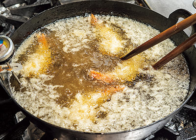 13. 海老の尾をもち、頭側から油に入れる。素材を入れると油温が下がるので、火を強めて温度を上げる。一度にたくさん入れるのは温度が下がるのでNG。