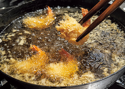 と古賀シェフ。揚げ油は新しいものよりも、むしろ何回か揚げて肉や魚介の香りや風味を含んだ状態が洋食のフライにとっては◎。ダシに調味料を入れると味が決まるのと同様で、ごま油をブレンドした揚げ油にうまみがあるので、どんどん味がのり、揚げ油自体がフライの調味料になるのだといいます。ここを押さえれば絶品になる!海老フライの全テクニックを、古賀シェフにていねいに解説してもらいます。