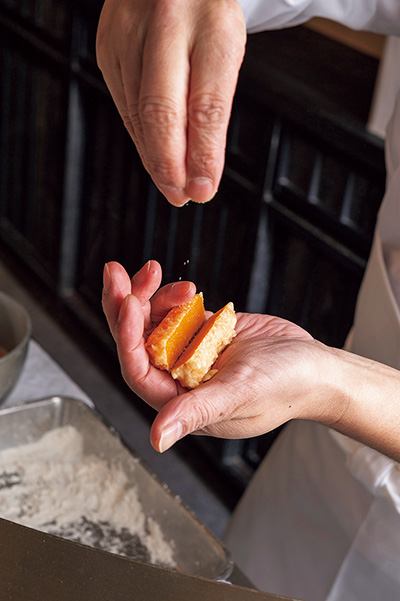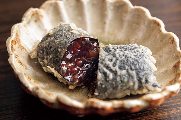 飛騨高山の伝統野菜、宿儺(すくな)カボチャは赤子をおくるみでくるむように毛布で大切に包み、3ヵ月ほど熟成させる。天ぷらに揚げ手が塩をするのはくすのきの流儀のひとつだが、このカボチャは半分に切って切り口に塩をふり、元にもどしてぎゅっと握って塩を溶かしたところで供する。塩のふり加減がどれほど天ぷらにとって大事なものか、あらためて知ることになる。
