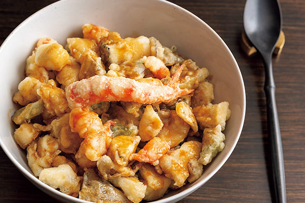 弟子が揚げ場を仕切る「くすのきの天丼」の日は、天丼のみの営業ながら日に80人近くも集客し、未来の職人が育っていく。季節の具5種ほどをバラ揚げし、海老を一本。油ギレがよいからこそのおいしさで、スプーンで好みの具をすくいながら口に運ぶのが楽しい。