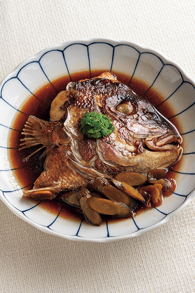 鯛の頭…1尾分 ゴボウ…60g ショウガ…15g A[醤油、水…各150ml 酒…75ml 砂糖…90g] 太白胡麻油…小さじ2 木の芽…少々